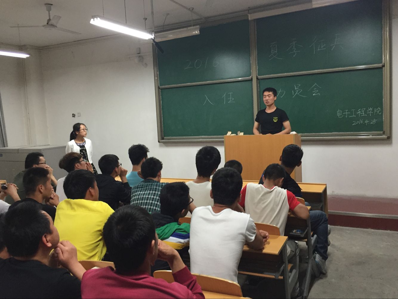 为宣传2016年夏季征兵工作,提高pg游戏电子模拟器学生应征入伍的积极性,pg游戏特于4月25日晚八点在阎教1320教室进行了2016年夏季征兵入伍动员会。本次动员大会的主讲人为张小妹老师和退役士兵郭林林学长,pg游戏各班班长与有入伍意向的学生参加了此次动员会。