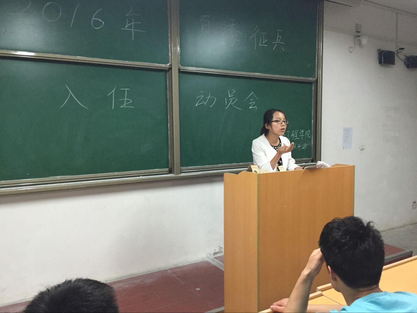 会议开始,张小妹老师让大家通告了2016年夏季征兵时间、要求与国家政策等各种相关信息,详细解释了大学生应征入伍的待遇政策与入伍后的注意事项和要求。随后由退役的郭林林学长讲解了入伍的身体条件及军队的各项硬性指标,最后由同学们自由提问,张老师与郭学长认真地解答了同学们的困惑。