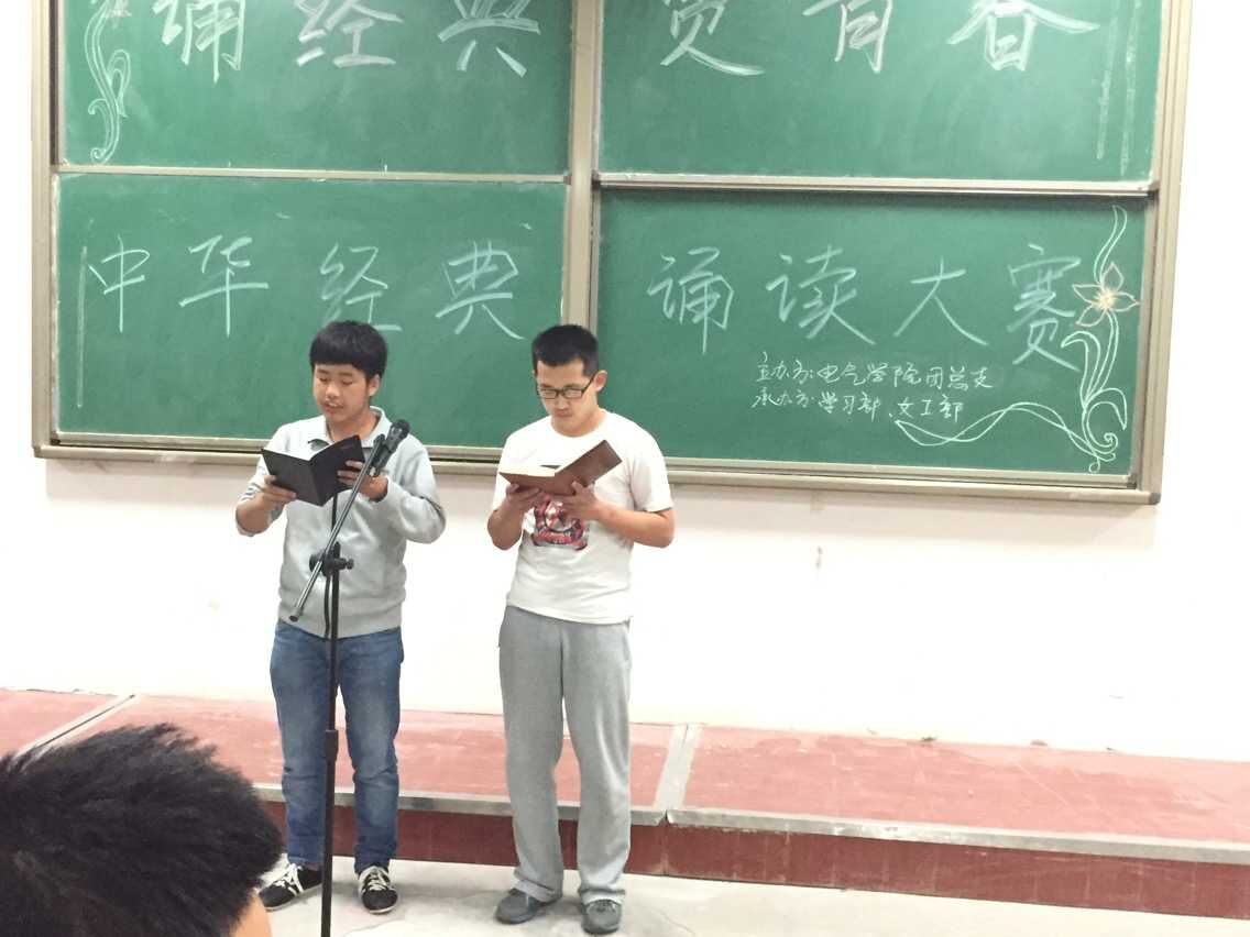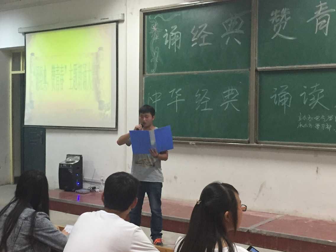 电气学院五月“青春”主题活动之“诵经典、赞青春”诵读大赛初赛于5月11日下午七点,在阎良校区阶梯二教室举办。本次活动由电气学院团总支主办,学生会学习部和女工部承办。活动起始初,由主持人致开场词,介绍前来参与活动的各位评委。电气学院学生会副主席李丁,秘书部部长徐聪、陈敬萧,生活部部长张晓,自律部部长张政,宣传部部长马舒威出席了本次活动并兼做评委。电气学院各班级参赛同学参加了此次活动。