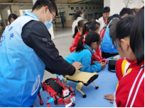飞行表演结束后,电协成员和团总支工作人员在操场布展,展出了成熟的科技作品,包括仿生六足机器人、仿生四足机器狗、仓颉写字机器人等,并为小朋友们展示并讲解了机器写字、飞行器飞行、机器人控制的过程和原理,让学生们零距离感受和体验科学技术,激发小朋友们对科学探索、科技创新的热情。