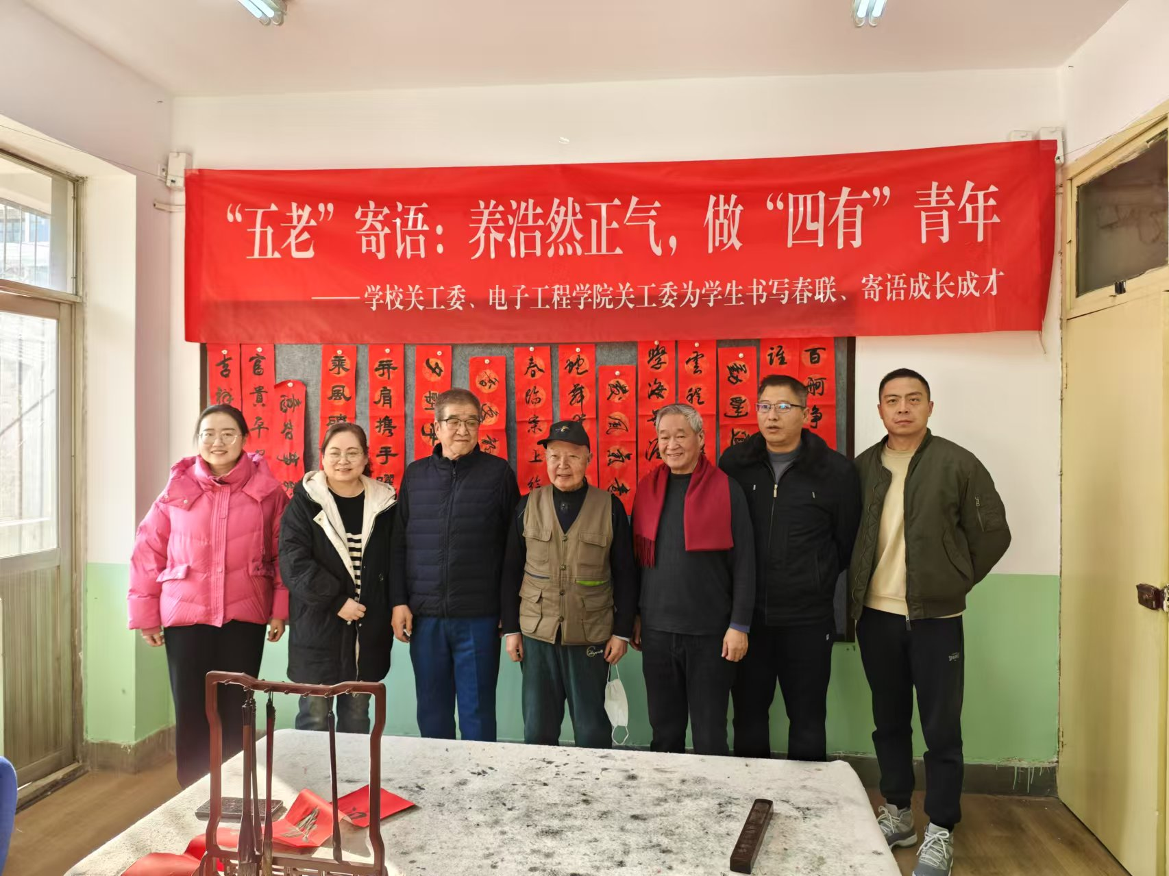 为深入落实为党育人、为国育才使命,弘扬“航空报国、立德树人,激情进取、志在超越”学校精神,充分发挥“五老”育人作用,激励pg游戏优秀学生不断成长成才,1月17日,学校关工委、pg游戏电子模拟器关工委联合开展“养浩然正气,做‘四有’青年”主题活动,在新春来临之际,学校“五老”代表郑泽尧、杨高民、孙肈元等挥毫泼墨,把美好的祝愿融入春联中,寄语pg游戏获得国家奖学金的优秀学生成长成才,以表彰过去一年来学生的努力,让家长们看到学生的成长。学校关工委办公室主任史正元,pg游戏电子模拟器院长杨亚萍、副书记郝杰出席本次活动。