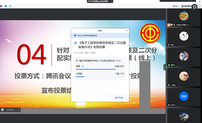 参会人员为75人,占全院人数80%以上,经投票统计,最终62票同意,13票不同意,同意绩效分配方案的人数达参会人数的82%,《pg游戏电子模拟器绩效考核及二次分配实施办法》获得通过。