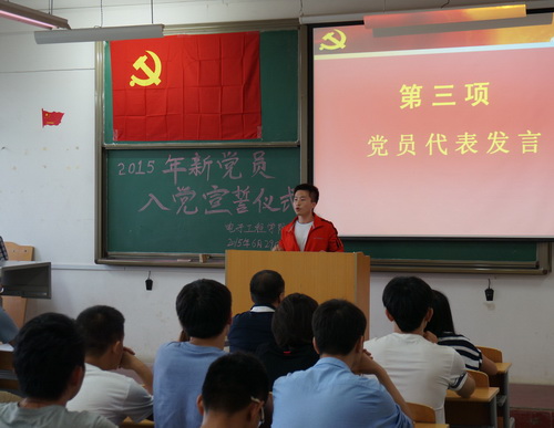 庄严肃穆的国际歌拉开宣誓仪式的帷幕。首先,由李亚胜老师进行领誓,92名学生预备党员在党旗下郑重宣誓,简短有力的百字誓词表达了他们对党的郑重承诺。接下来,学生党员高江涛与预备党员白欣鹏代表发言。两位同学就党员职责义务和如何在学习生活中发挥榜样的力量,谈了自己的认识。最后,孙护军老师做总结讲话。他首先对预备党员表示祝贺,同时要求全体党员继续加强理论学习,提高党性修养,树立模范带头作用,不辜负党组织的培养,做一名爱国、爱党的好青年。伴随雄壮激昂的义勇军进行曲,宣誓仪式圆满结束。