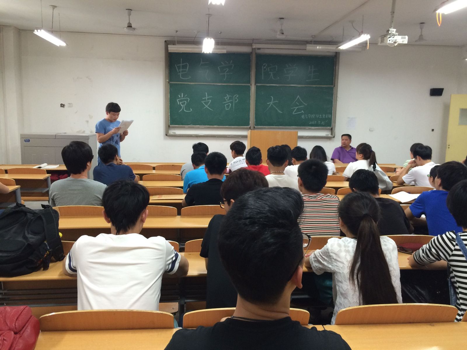 2015年5月13-14日,电气学院在1311教室内召开了学生党支部大会。本次会议共分两个议程:预备党员转正和积极分子入党。审批大会由任志刚老师主持、电气学院学生党支部成员共同参加。