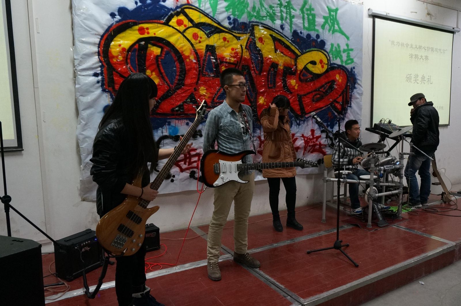 本次晚会以乐队演唱的方式拉开帷幕,全场沸腾,气氛热烈。主持人介绍本次比赛结果投票数由院团总支微信公众平台和现场两部分组成,各占百分之五十。然后由各参赛选手的对自己的涂鸦作品进行创作灵感和对社会主义核心价值观理解的阐述后,由到场同学开始投票。在激烈的投票过中,文艺部进行了才艺表演,又将现场气氛带到了高潮。通过现场计票统计结果,选出包括三组最佳奖在内的一二三等奖共九组获奖作品,最后pg游戏党委书记、院长杨勇老师总结大赛发表讲话,为期九天的活动圆满闭幕。