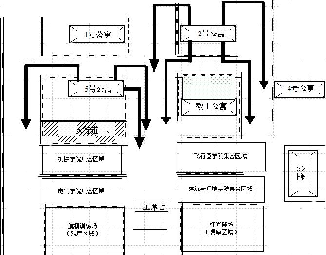 主席台在灯光球场与航模训练场中间路口位置、学生集合点在5#学生公寓和教工公寓以南路面及人行道(详见附件3)。