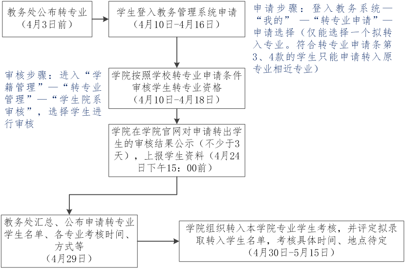 转专业学生条件审核时,主要审核申请对象、转专业条件两个方面是否满足学校转专业规定要求,详细内容如下两点,具体学生转专业申请及审核见图1。