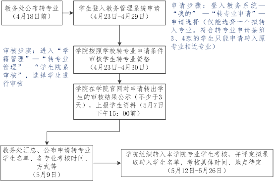 转专业学生条件审核时,主要审核申请对象、转专业条件两个方面是否满足学校转专业规定要求,详细内容如下两点,具体学生转专业申请及审核见图1。