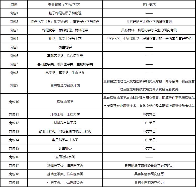 (二)以上岗位不招收应届毕业生。凡与国家自然科学基金委员会机关和直属单位工作人员及离退休人员有夫妻关系、直系血亲关系、三代以内旁系血亲或近姻亲关系的,不得应聘。